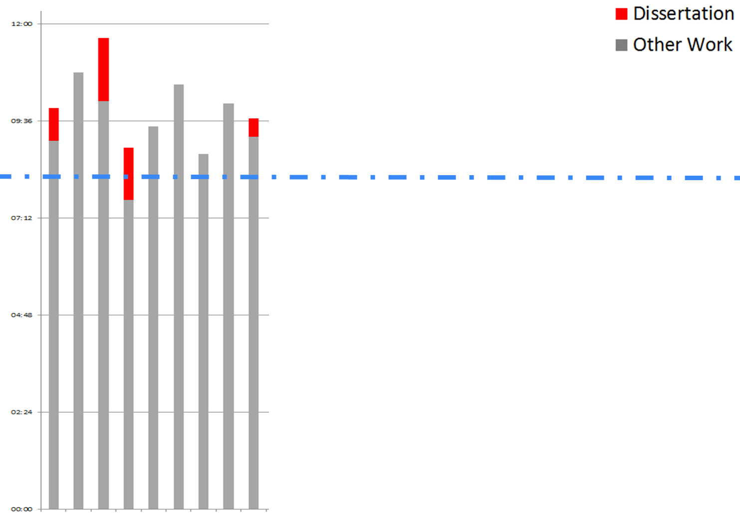 While the red areas increased, most of my time was still dedicated to non-dissertation tasks. The remaining gray time was required for tasks that I was not at liberty to abandon (e.g. because they involved teaching or research projects that funded my position).